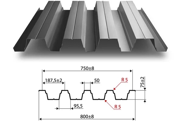 Это профилированный лист, изготовленный из оцинкованного металла, который препятствует возникновению коррозии и продливает срок службы металла на 50%. Высота профиля равна 8 мм. Полная ширина равна 1150 мм, рабочая - 1100 мм, именно ее и нужно учитывать при расчете необходимого количества.