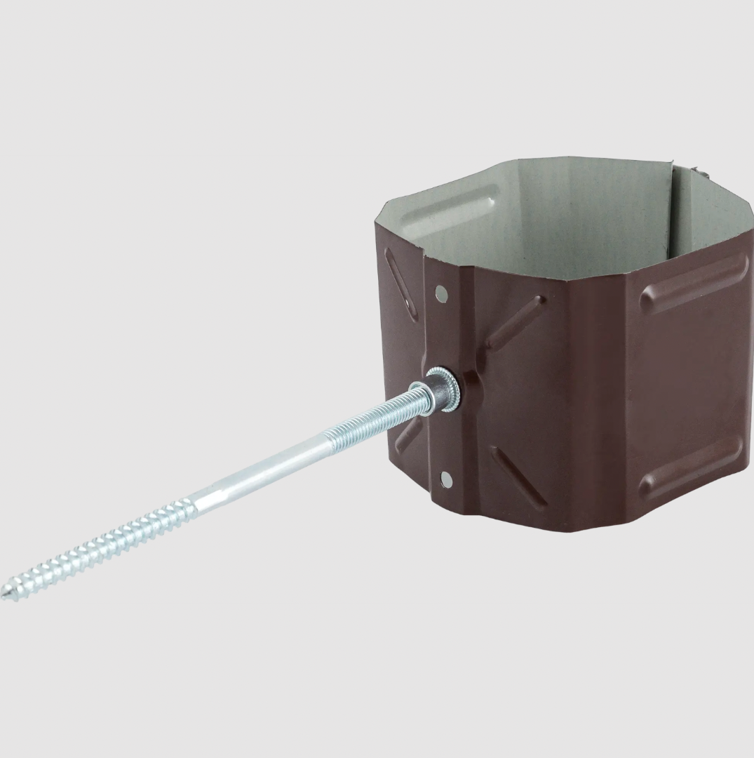 - Крепление выполнено в каштановом цвете. Для придания водосточной конструкции гармоничного вида оттенок элемента подбирается в тон трубам.