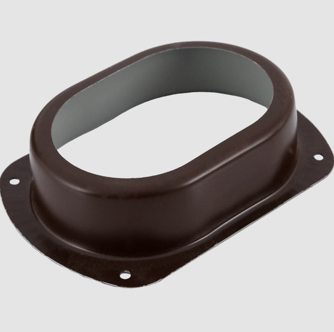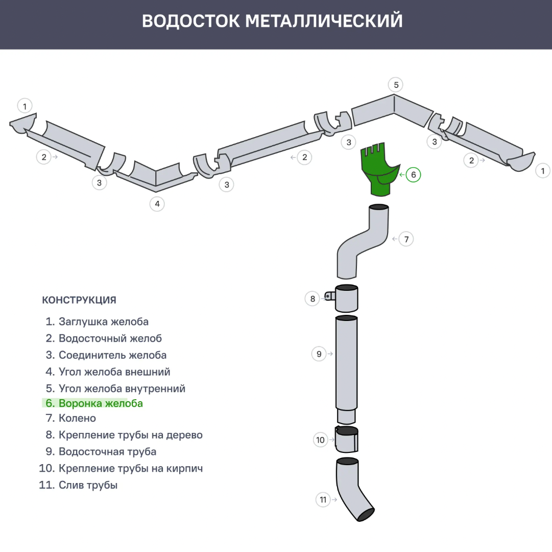 Воронка врезная соединяет желоб с водосточной трубой. Предназначена для сбора и вывода дождевой или талой воды. Покрытие коричневого цвета выполняет защитную и декоративную функцию. Страна производства — Россия.