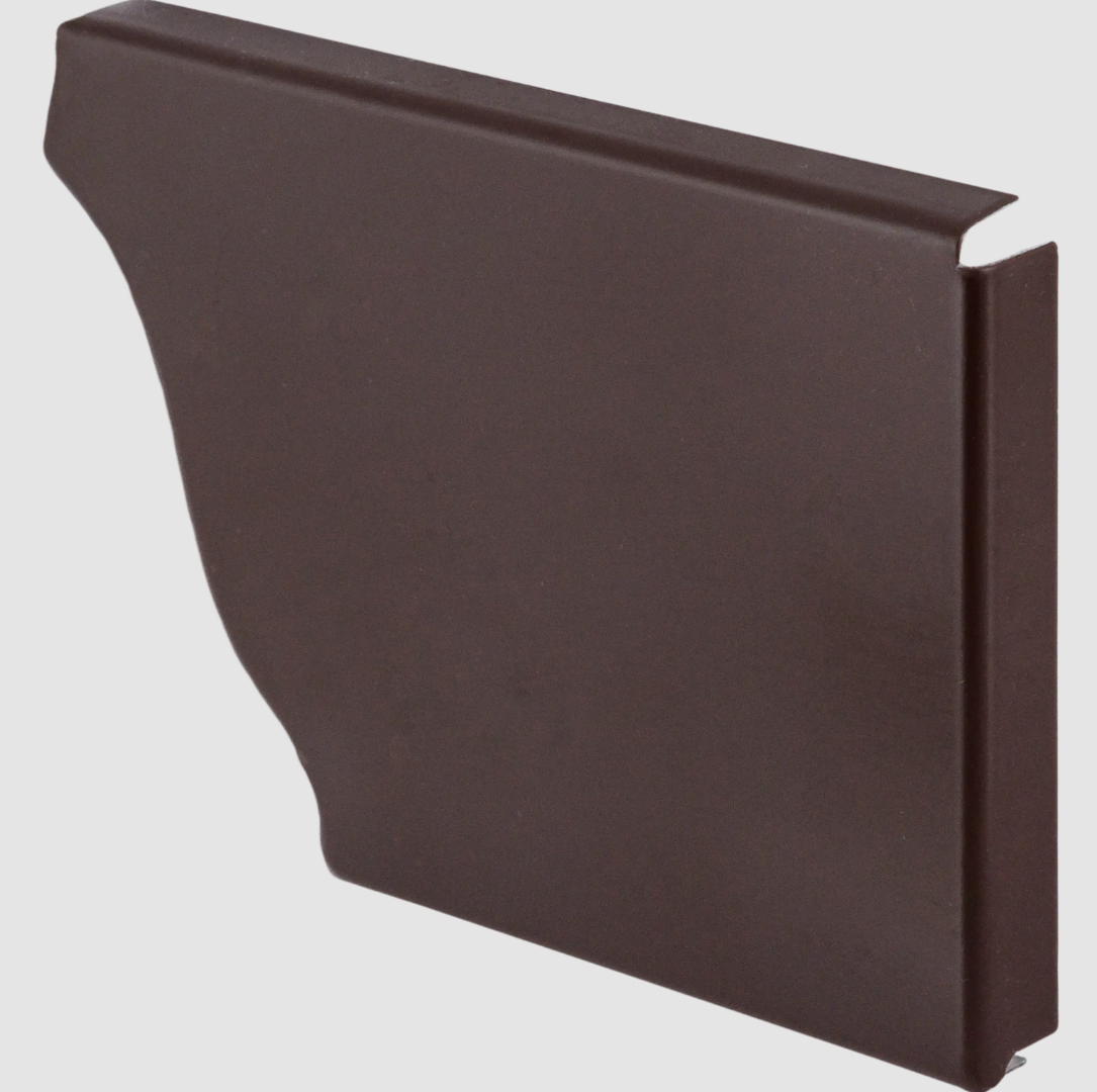 Заглушка правая фиксируется на торцах желоба и предотвращает протечку дождевой или талой воды. Прочный материал заглушки обеспечивает жесткость и надежность конструкции. Коричневый оттенок элемента подбирается под цвет желобов и других частей водостока.