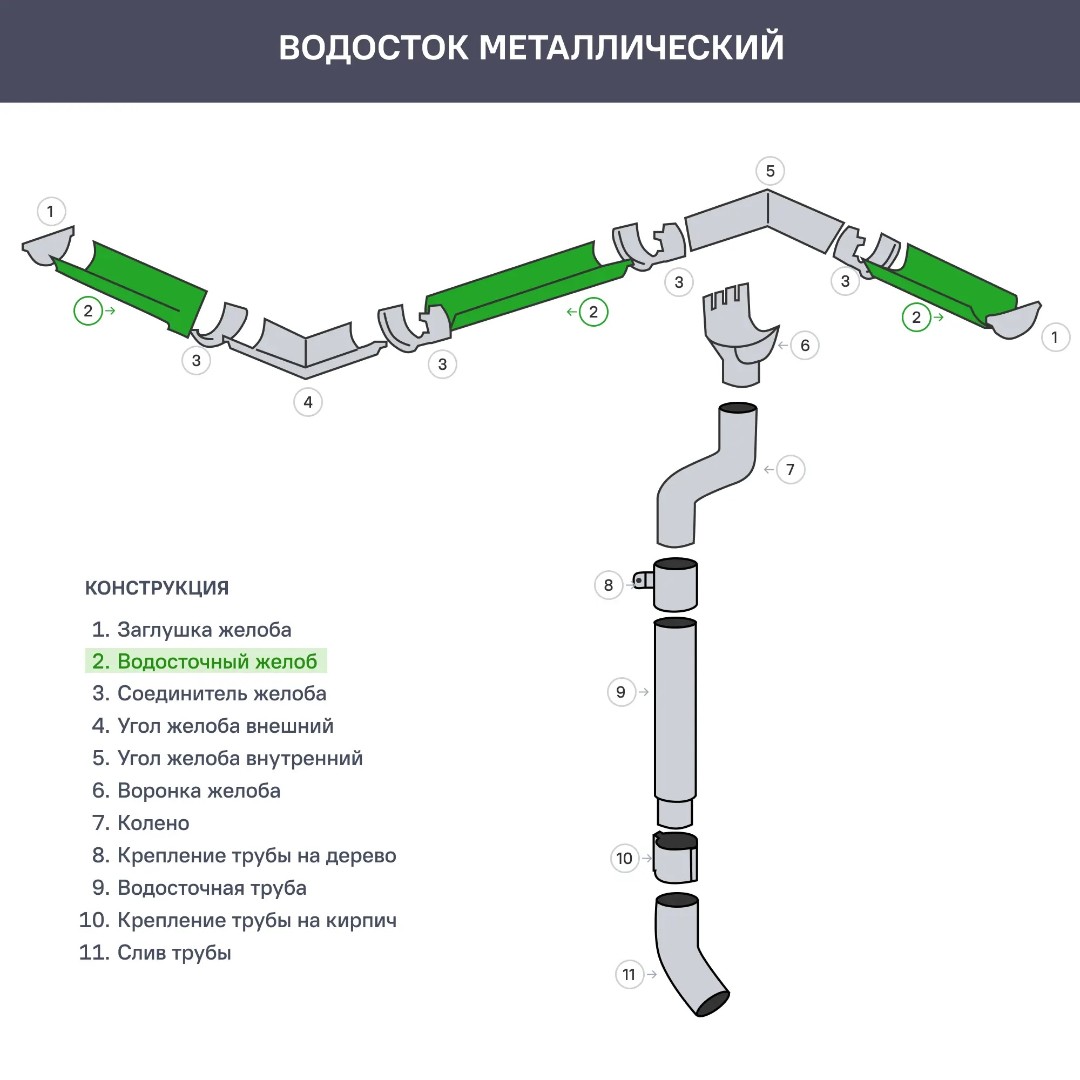 Желоб — это элемент водостока, который применяется для отведения сточных вод. Изготовлен из оцинкованной стали, готовая конструкция получается прочной и надежной. Покрытие выполняет декоративную функцию и защищает материал от воздействия влаги и температур. При креплении важно соблюдать угол уклона, чтобы собранная вода свободно стекала и не застаивалась в водостоке.
